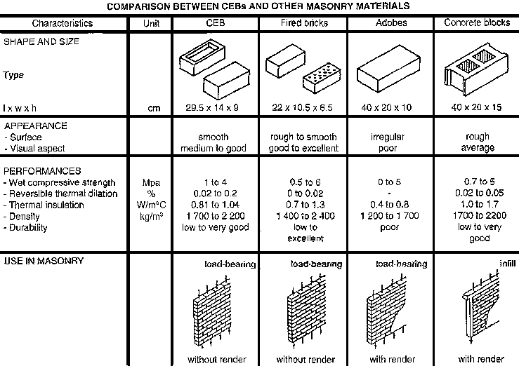 Whilst meeting the same requirements as other present-day building materials, the CEB also presents a technological alternative to imported materials, the use of which is often justified because of the need for standardisation. CEBs have the advantage of being produced locally, whilst still meeting this need.