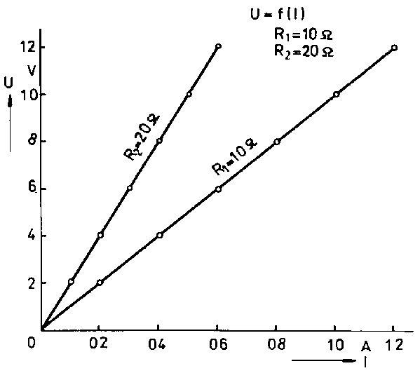 When the measuring results are interpreted graphically, the U-I diagram shown in Fig. 3.5 is obtained. The functional correlation between U and I is linear. The slope of the straight lines is the steeper, the higher the resistance R is.