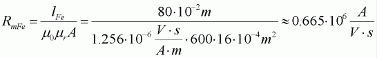 Below, the above mentioned magnetic quantities are presented, in the form of a list; further their mathematical correlations and their units are given. The shown fundamental equations can be applied easily. In analogy to the electrical circuits one has to observe that, for example, the magnetic flux in a branched magnetic circuit is divided into individual fluxes and the total magnetic resistance Rmers is smaller than the smallest individual resistance. In an unbranched magnetic circuit with several magnetic resistances connected in series, the total resistance Rmers is equal to the sum of the individual resistances; the sum of all magnetic potential drops is equal to the total magnetomotive force. This shows that, analogously. Ohms law and the 1st and 2nd Kirchhoffs laws are applicable. Example 5.1 deals with an unbranched magnetic circuit with two magnetic resistances RmL and RmFe connected in series.