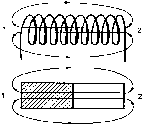 When a conductor is wound on a cylinder in the form of a spiral, one obtains a coil. When current passes through it, a magnetic field is brough about which is made up of the fields of the individual turns of the coil. A long, cylindrically wound coil has a field which resembles that of a rod magnet (Fig. 5-5.). Which end of the coil forms the north pole and which the south pole is dependent on the direction of current and can easily be found with the help of the pole determination rule: