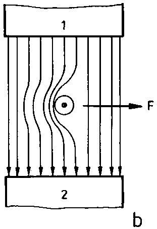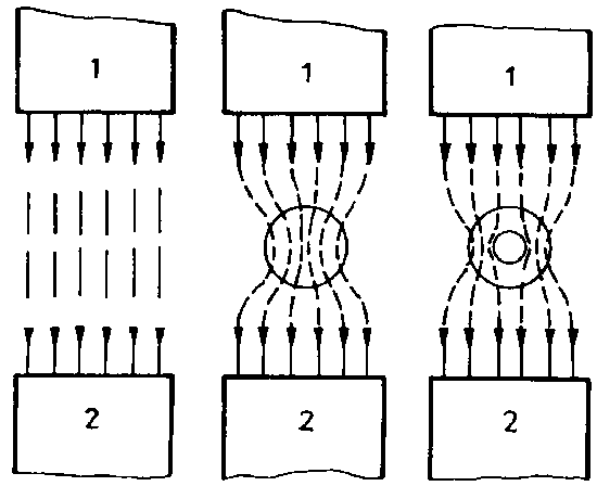 When placing a piece of iron in the field of a magnet, the field line distribution will change considerably (B.5.6.). Like nickel, cobalt and their alloys, iron also is a very good conductor for magnetic field lines. Therefore, these materials are called ferromagnetica. Fig. 5.6. shows how the parallel course of the field lines (homogeneous, i.e. uniformly built up field) is changed by a ferromagneticum. In general, the following holds: