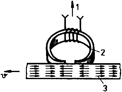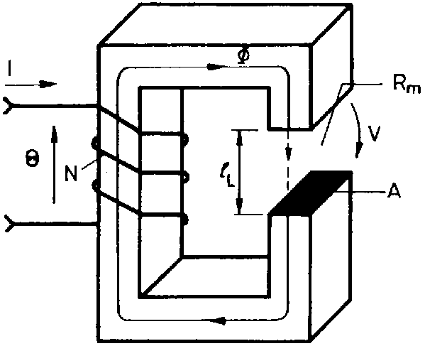 As has already been said above, every current is associated with a magnetic field. A coil through which current flows is also surrounded by a magnetic field. In the coil, electrical energy is converted into magnetic energy. Since the field lines are closed in themselvers, we speak of a circle in which the magnetic field is caused by a magnetomotive force. The coil through which current flows is the seat of this magnetomotive force Q 1) It is the greater, the greater the current is and the more turns the coil includes. Fig. 5.7. shows a magnetic basic circuit. This circuit consists of a coil with N turns through which a current I passes. The ferromagnetic conductor is not closed but separated by an air gap.