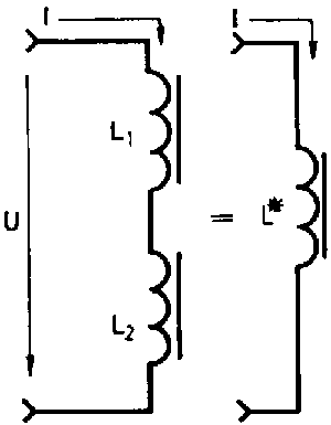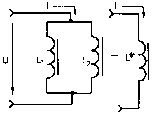Like resistors, coils can be connected in series or in parallel. In series connection according to fig. 5.27., the same current passes through the coils with the individual inductances of L1 and L2. In case of a current variation, voltage proportional to the individual inductances of the coils in induced in the latter. The equivalent inductance of this arrangement is