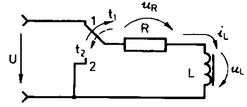 A coil is connected to a direct voltage source according to Fig. 5.29. (switch position 1). At the instant of switching on (time t1), current starts flowing. The maximum current limited by R cannot flow immediately because self-induction counteracts any current change. After a short time, the current has reached a certain value and the magnetic flux the value proportional to the current. The current causes a voltage drop at the resistor R; consequently, the voltage across the coil is reduced. In the following time, the current is not allowed to rise as quickly as immediately after the instant of switching on. All this shows that, after switching on, the current first increases rapidly and then more and more slowly while the coil voltage first drops rapidly and then more and more slowly.