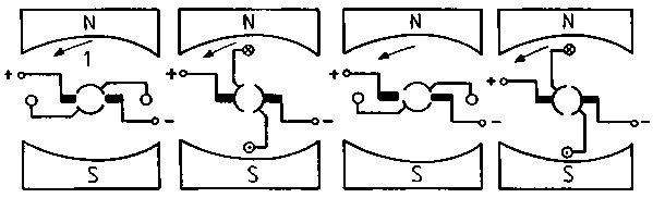 The forces are then still effective but do not constitute a torque. The current direction in the conductor loop must be reversed in the neutral zone in order to attain a further rotation. Current direction change in the direct current machine is handled by the commutator which switches over the current direction in the conductor loop after a semi-rotation. Thereby the voltage attached to the carbon brushes is transformed in the conductor loop into alternating voltage. Figure 90 depicts this process.