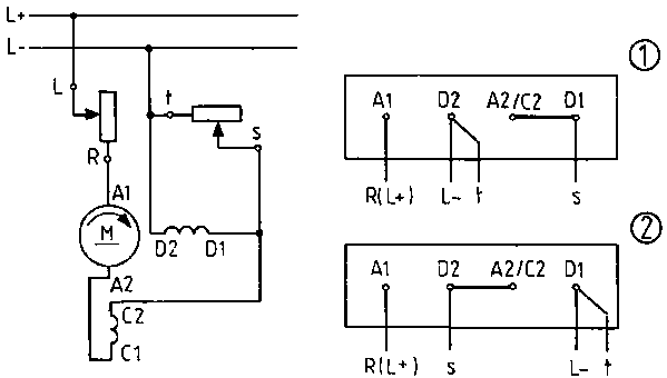 The direct current series motor is a direct current motor whose exciter windings (D1, D2) have been series-switched to the rotor winding.