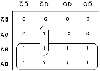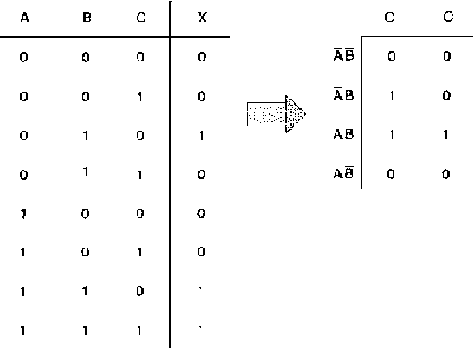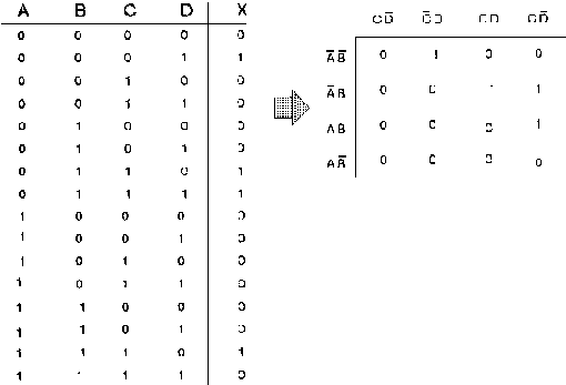 The truth table outputs are translated into the Karnaugh map. Each position in the map represents a certain fundamental product.