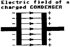 You know that, whenever there is a voltage between two points, an electric field is arising between these two points. You also learnt in Basic Electrical Science that whenever a capacitor is charged, one plate will be positiv and the other negativ. The consequence of these two facts is, that an electrical field, having a direction towards the positivly-charged plate, is build up between the capacitor plates as shown in figure 18 below.