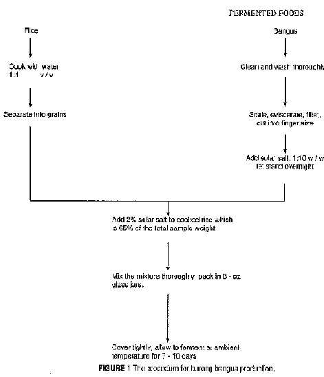 There are several kinds of burong isda sold in the market, each named for the kind of fish used. One example is burong dalag, a fermented rice-fish mixture using mudfish, Ophicephalus striatus. Other kinds are shown in Table 1. Our particular study deals with burong bangus, a fermented rice-fish product using milkfish, Chanos chanos, or loangus in the vernacular. The method of preparation is shown in Figure 1.