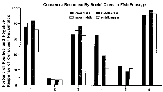 The experimental sausages were evaluated on a kibbutz in Israel and in 110 households in Costa Rica. The results of the evaluations in both countries were encouraging. In Israel the scores were 5 to 5.6 out of a maximum of 9 for the 50 percent fish sausage. Over 80 percent of the tasters in Costa Rica gave positive responses to the sausages that contained fish (Figure 2). The highest social class was least enthusiastic about the sausages. In Costa Rica the population is not accustomed to eating nonheated sausages. The evaluators therefore either cooked or fried them before eating. The organoleptic tests are consequently being repeated with new instructions.