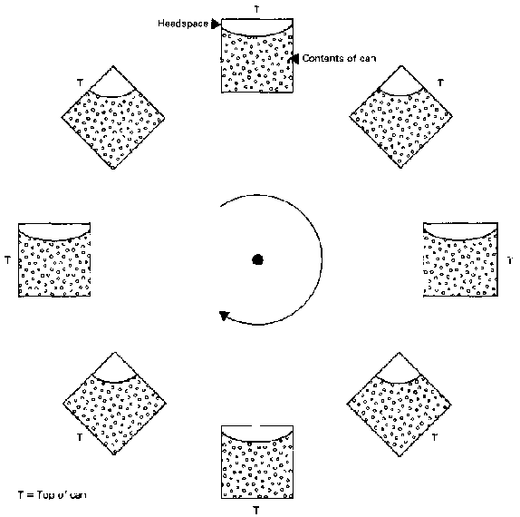 Heat transfer through the fish is by conduction and, therefore, very slow; at a processing temperature of 121°C, it would take 6 hours to raise the centre temperature of a 145.5 mm (diameter) by 168 mm (height) can from 10 to 100°C by conduction alone. In this time, the fish nearest the walls of the container would be grossly overcooked. By comparison, if ail the heat could be transferred by convection, in the same size can under the same conditions, it would only take 20 minutes to achieve the same temperature rise at the can centre. Obviously, it is best to have the fish surrounded by liquid so that the distance through which heat is transferred by conduction is kept to a minimum. Most fish canners increase in-can heat transfer rates even further by processing the cans in a rotary retort. The movement of the headspace bubble during rotation forces an increase in liquid movement and, therefore, convection heat transfer. The fish are more evenly cooked throughout the can and, those nearest the can walls are less likely to be overcooked (See Figure 3).