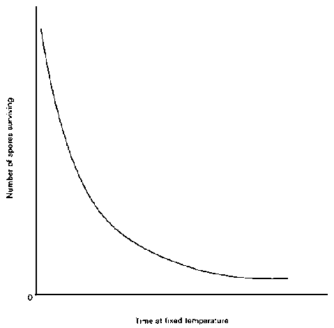 Figure 6 is a thermal death curve showing the number of surviving spores against time at a given process temperature. Figure 7 is a death rate curve and shows the log10 number of surviving spores against time at a given process temperature. These figures show that the destruction of bacterial spores at a given process temperature is not instantaneous but decreases logarithmically with the exposure time to that temperature. The time taken for the graph to traverse one log cycle (i.e. the time taken at a given temperature to reduce a particular bacterial spore population to one tenth of its original number) is called the Decimal Reduction Time, D(O) (O being the given temperature).