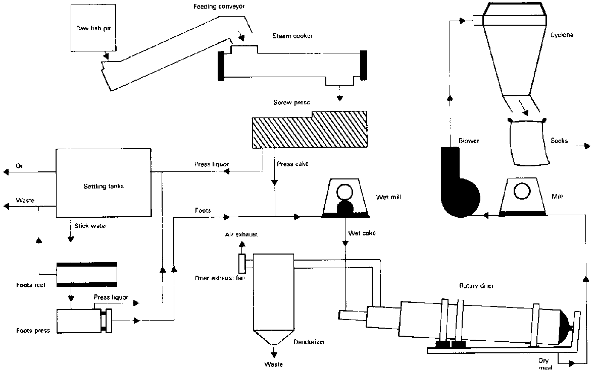 The wet reduction process is used primarily for the production of meal from fatty fish such as menhaden, herring, pilchard, anchovy etc., which are caught specifically for fishmeal production. The process is a continuous rather than a batch process and is particularly suitable for large-scale operations. The essential steps in the wet reduction process are as follows:
