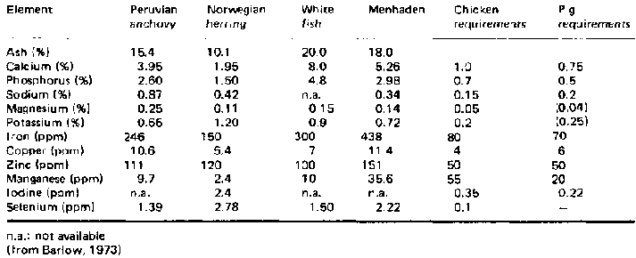 Fish meals can also be an important provider of minerals. Of particular interest to feed formulators are calcium, phosphorus, sodium, magnesium, potassium, iron, copper, zinc, manganese, iodine and selenium which can be deficient in a mixed diet. The following table gives the mineral contents of some fish meals and the mineral requirements for chickens and pigs: