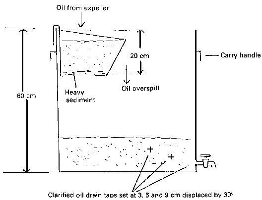 Crude oil from an expeller tends to contain high levels of sediment, usually about 10-15%. A convenient oil collection vessel (shown in Figure 14) is constructed from a 200 l oil (45 gal) drum. The coarse foots which separate in the primary collection vessel may be added in small amounts to the fresh seed for reprocessing, but the fine sediment, when isolated (normally either by standing or in a filter press), is best used as a fertilizer or admixed with the cake.