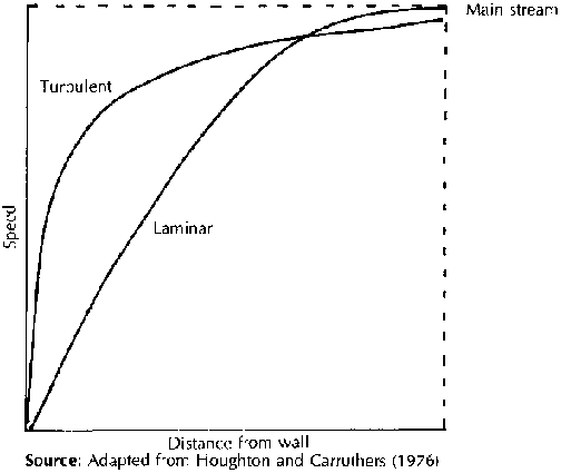 Air flow in wind is laminar and/or turbulent. Laminar flow implies little exchange of mass between different layers, while turbulent flow has such exchange with resultant Reynolds or shearing stresses. Figure 1 below contrasts laminar with turbulent flow.