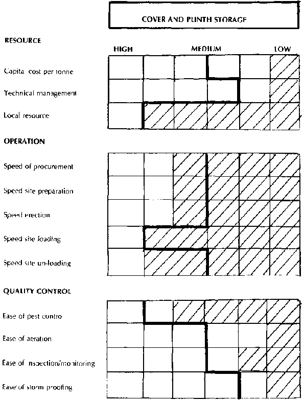 Management specify the level of resources, the ease of operations and the degree of quality control required. This step requires management to have detailed knowledge of local requirements. For example, a local requirement might be for a system with average (medium) cost, below average technical management, ample local labour (resource), fast loading, good pest control, but below average storm proofing (see Figure 2). When these have been pencilled in, the characteristics of the alternative systems are marked with hatching over the requirement profile, when they can be compared. In Figure 3, CAP storage has lower capital cost/tonne, lower management demands than required but uses local resources (labour and materials). All operations are more than up to requirement but CAP is under requirements for pest control, aeration, inspection and storm proofing. Flexible silos (see Figure 4) cost more, demand more technical management than CAP, but use fewer local resources. They are easier to site/erect than required, though slower to load than required.