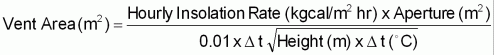 Note: This vent size area has been calculated using a very high insolation rate. By substituting a high insolation rate, your vents will be large enough to always prevent overheating, even under the most intense sun conditions. If the sun conditions are not at their maximum, you can always close the outlet vent to raise the internal temperature of the dryer, if necessary. (For example, with the lower insolation rate of 15 MJ/m² day, the vent area will only need to be 8,030 cm², or about half.)
