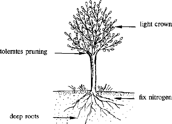 Agroforestry trees should have a light crown so that the shade provided is not too great for the agricultural crops. They should tolerate pruning (i.e. the cutting of branches) and regenerate well afterwards (e.g. Grevillea robusta or Cordia species) so that their leaves can be used as fodder and the shading of crops can be controlled. Preferably they should be able to fix nitrogen to improve the soil. The roots should be deep rather than close to the surface. Aggressive species that invade agricultural or growing land with root suckers or abundant regeneration from seed have to be avoided.