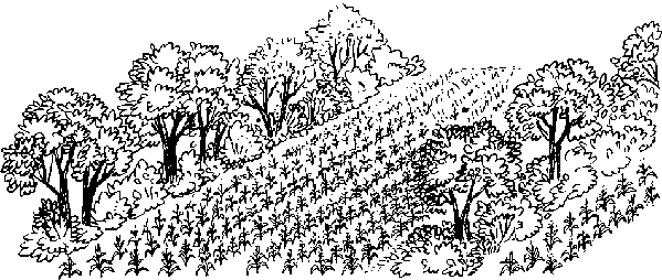 After ground preparation food crops are planted. Normally annual crops are cultivated such as beans, maize or sweet potatoes. A particularly good combination are sweet potatoes cultivated on ridges, as shown in the figure opposite. Sweet potatoes can grow on relatively poor sites, they are quite shade-tolerant and the ridges provide excellent soil and water conservation. Perennial crops like bananas, papaya and cocoa can also be grown. Tree seedlings are planted at the same time, or one or two years after the food crop. Large tree seedlings should be used because they are sturdy and easily seen. Spacing between the rows of trees should be wider than for a normal plantation to delay the time when the canopy of leaves closes over and shades the food crop.