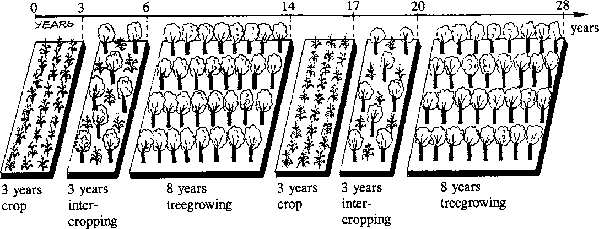 When intercropping trees and crops, follow in sequence and combine restoration of the soil by trees with agriculture. The land is usually devoted to food growing for some years before trees are planted. Thereafter the agricultural crop is grown together with tree seedlings for some years until the shade from the trees interferes with the growth of the crop or the agricultural crop with the growth of the trees.