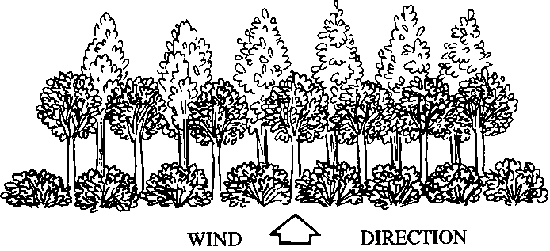 Shelterbelts or windbreaks are strips of trees and other vegetation that reduce the force of the wind. They are very important in areas with frequent high winds and windblown sand. Often they consist of several rows of shrubs and trees of different heights.