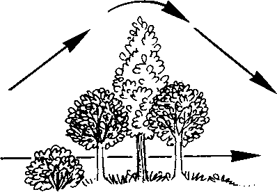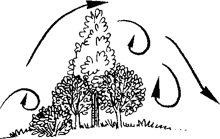 Shelterbelts are most effective if they do not block the wind completely, like a wall, but force it to slow down. If the wind cannot pass through the shelterbelt at all, it will try to pass underneath it or over the obstacle. If it flows over the shelterbelt, it produces turbulence which is harmful for the crops behind the belt. If it goes underneath, the belt acts like a funnel and the wind becomes very strong. Therefore choose large trees for the centre row. On each side of this row plant one or two rows of smaller species. Outside these rows shrubs or other vegetation can be planted to make sure that the wind cannot pass underneath the belt. Plant the trees with close spacing, e.g. 1-2 m apart.