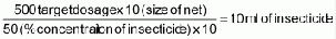 The active ingredient (a.i) in mg or g (or ml for the WP formulations) = surface area of net (m2) x target dose (mg or g a.i/m2). For example,