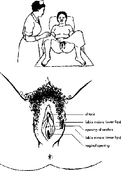 The vulva is the area around the opening of the vagina which can be seen from the outside (see Figure 3.2). The outer folds of skin, called the labia majora, are thick and covered with hair. The two inner folds of skin, called the labia minora, are much thinner. These inner folds form a hood around the clitoris, a small, sensitive organ above the vagina that responds to stimulation and makes sexual intercourse pleasurable. Inside the vaginal opening is a pair of glands that produce a thin fluid which moistens the vagina, especially during sexual excitement. In countries where female genital mutilation is practised, some women may have either the clitoris, or the clitoris and labia, removed. In some cases the labia may be sewn together (see Chapter 2 for a discussion on the effects of female genital mutilation).