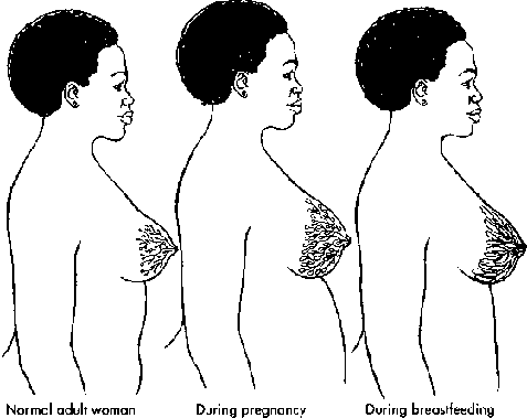 The main external feature of the breast is the nipple and the dark skin around it, called the areola. Inside, the breasts consist of fat and sacs called "glands" that produce milk. In many women, one breast is larger than the other. Often, both breasts swell slightly during the menstrual period. During pregnancy, the glands grow in size as they produce milk (see Figure 3.3); often some liquid comes out of the nipple even before the baby is born.