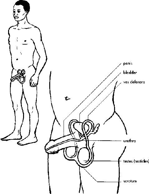The two testes produce the sperm which fertilise the woman's egg to start the process of reproduction. They are two egg-shaped organs, in front of and between the thighs, within a sac of skin known as the scrotum (see Figure 3.4). From puberty until old age, men's testes produce sperm all the time. While a woman releases one egg every month, a man releases 100-300 million sperm every time he ejaculates, or reaches climax, during sexual intercourse. During ejaculation, the sperm are carried in a liquid called semen that is produced by the man's reproductive organs. The semen passes through a tube called the vas deferens and out of the penis. One of the millions of sperm may reach an egg and fertilise it; the rest simply die in a few days and disappear.