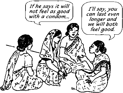 · teach men and women about the risks to their health and the health of their families from STDs. Find opportunities when women are together in groups, such as at the market or waiting at health centers, to explain how STDs are passed, and how to prevent them.· work with others to find ways to convince men to wear condoms. Practice in the group what to say to your partner to get him to use a condom.