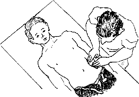 If the person has a constant pain in the stomach, with nausea, and has not been able to move her bowels, put an ear (or stethoscope) on the belly, like this: