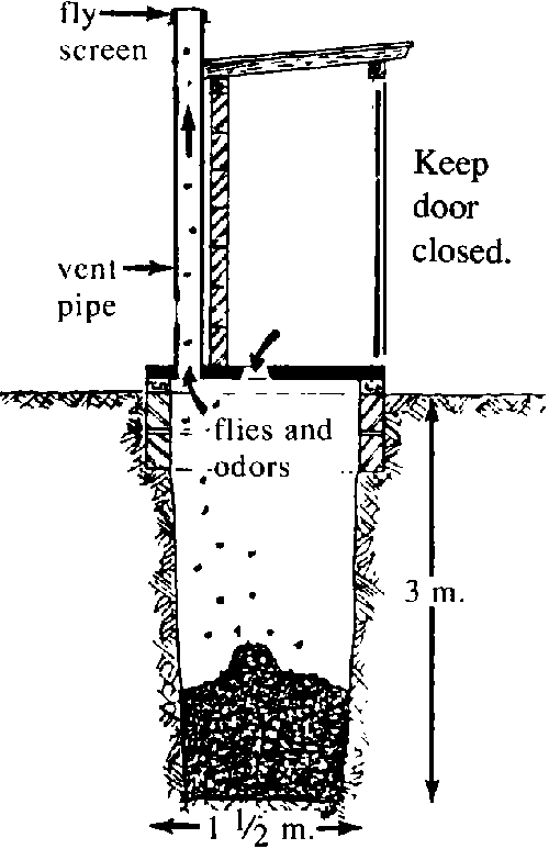 3. Build latrines (out-houses, toilets) so pigs and other animals cannot reach the human waste. A deep hole with a little house over it works well. The deeper the hole, the less problem there is with flies and smell.