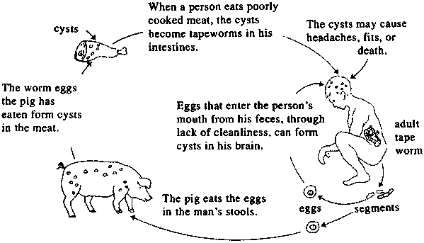 The greatest danger exists when the cysts (small sacs containing baby worms) get into a person's brain. This happens when the eggs pass from his stools to his mouth. For this reason, anyone with tapeworms must follow the guidelines of cleanliness carefully - and get treatment as soon as possible.