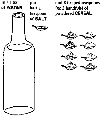 Note: In some countries packets of Oral, Rehydration Salts (ORS) are available for mixing with water. These contain a simple sugar, salt, soda, and potassium. However, homemade drinks - especially cereal drinks - when correctly prepared are often cheaper, safer, and more effective than ORS packets.