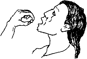 Figure· Put nothing in the person's mouth while he is having a fit - no food, drink, medicine, nor any object to prevent biting the tongue.