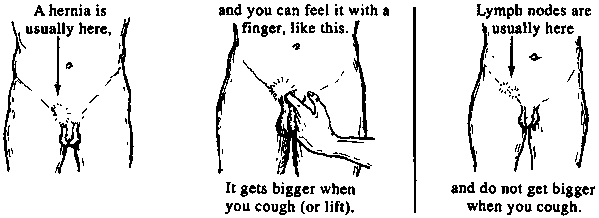 A hernia is an opening or tear in the muscles covering the belly. This permits a loop of gut to push through and form a lump under the skin. Hernias usually come from lifting something heavy, or straining (as during childbirth). Some babies are born with a hernia. In men, hernias are common in the groin. Swollen lymph nodes may also cause lumps in the groin. However...