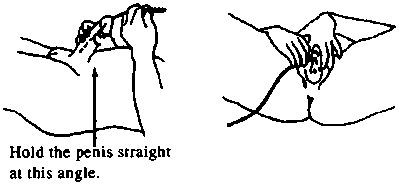 lips open, gently put the catheter into the urine hole. Twist it as necessary