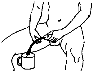 Important: If the person shows signs of urine poisoning, or if the bladder has been over-full and stretched, do not let the urine come out all at once: instead, let it out very slowly (by pinching or plugging the catheter), little by little over an hour or 2.