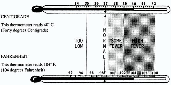 There are two kinds of thermometer scales. Centigrade (C.) and Fahrenheit (F.). Either can be used to measure a person's temperature.