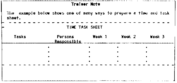 If time allows, include a discussion of how to organize resources to implement the project. you can show a time task chart such as the one in the Trainer Note and ask someone who has used this type of chart before to give an example and show how to use the chart for organizing materials, people and tasks over time.