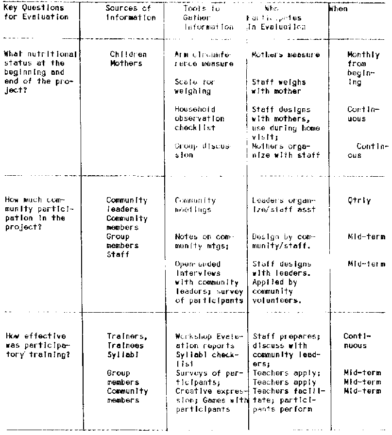 Distribute Handout 15B (Example of Project Evaluation). Review the sources of information, tools to gather information, who participates and when, for at least one of the key questions listed. Ask for an example of another key question, and have the group discuss and give the same kind of information as for the first example. Ask someone to record the ideas as they are suggested.
