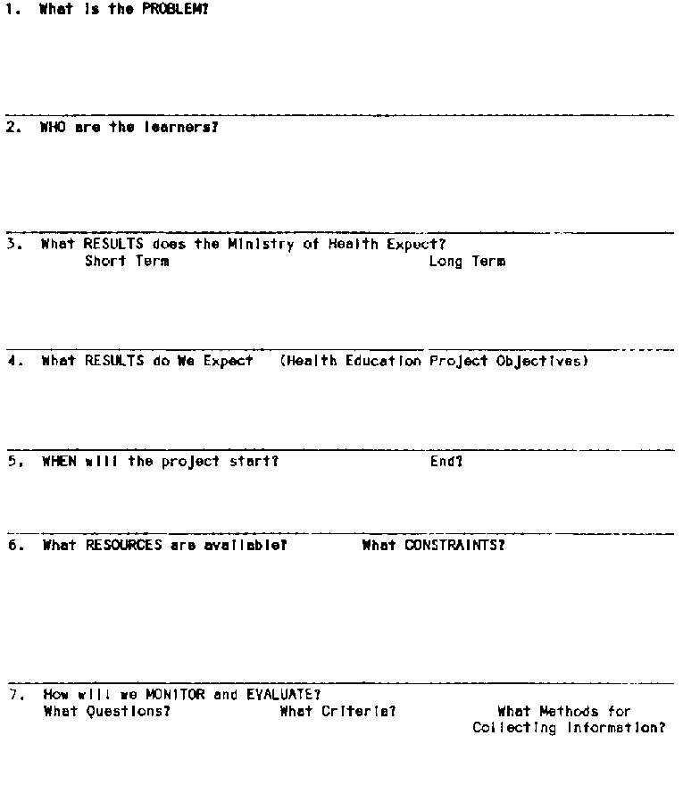 To say that there is a health problem is a very general statement which covers many specific situations. In order to plan your work, to set goals and to go into action, you must be able to define the specific problem on which you wish to work.