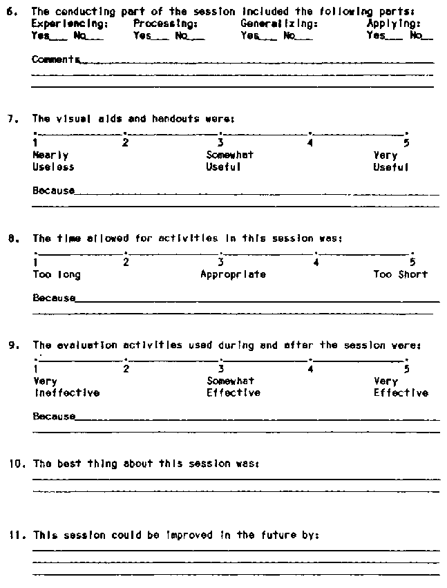 Have participants conduct their sessions. After each one, facilitate a 15 minute evaluation of the session. Encourage discussion of ways the session could be adapted for different situations.