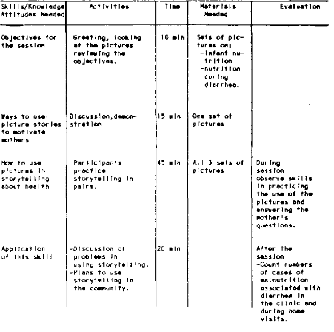 · Correctly select and use appropriate techniques of storytelling, using pictures to stimulate discussion and demonstration for specific health education objectives and a particular target group, following the guidelines given in Session 16.