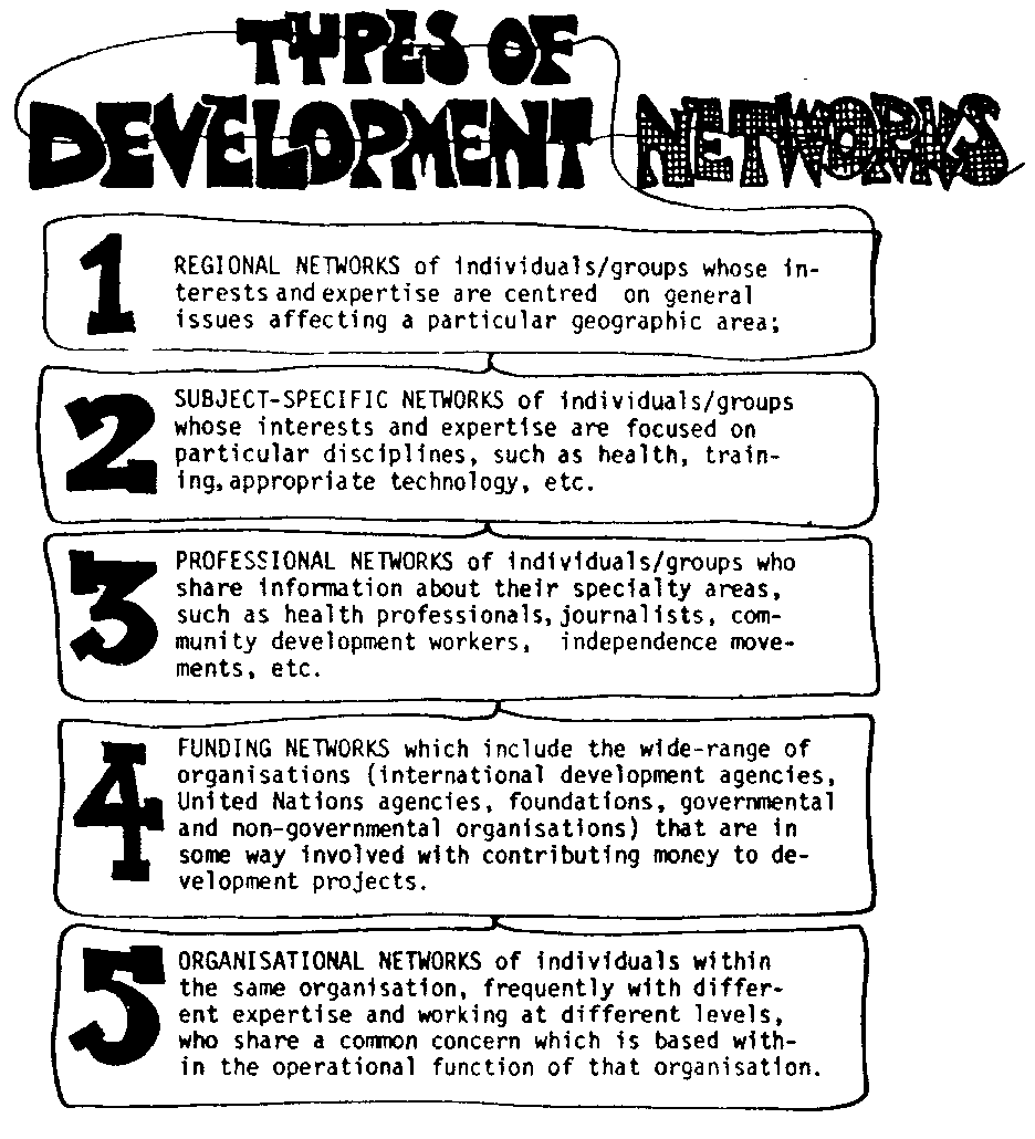 Networks within the broad area of "development" are numerous and wide-ranging in teems of their geographical and subject interests. There are many that are well-established and have access to financial, material and human resources that you should know about . These networks can be divided into the broad categories of: