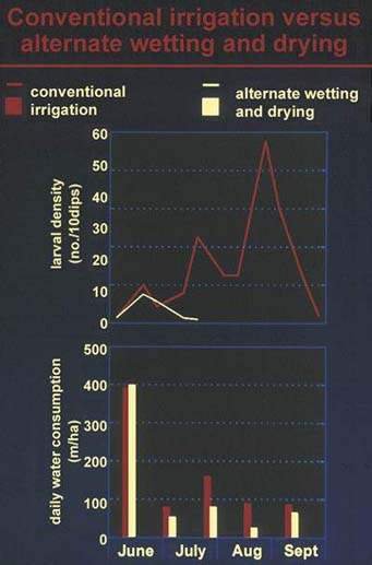 populations in conventionally irrigated rice fields versus those with alternate