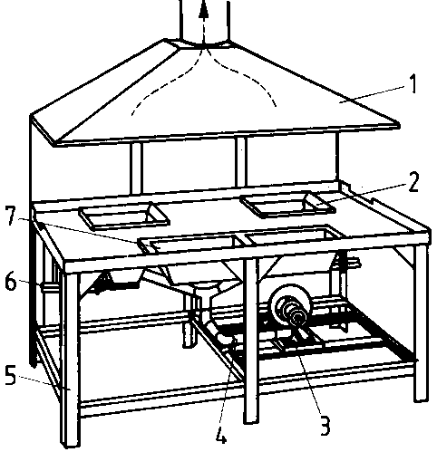 1 flue, 2 fire case, 3 blower, 4 air supply, 5 frame, 6 nozzles and