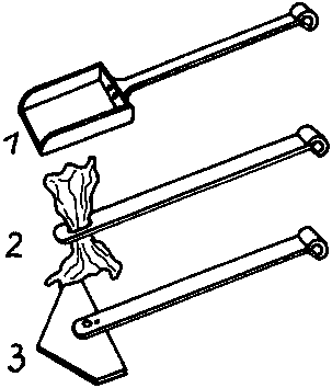 Smith's hearth is equipped with firing appliances: coal shovel, swatter and fire rake.